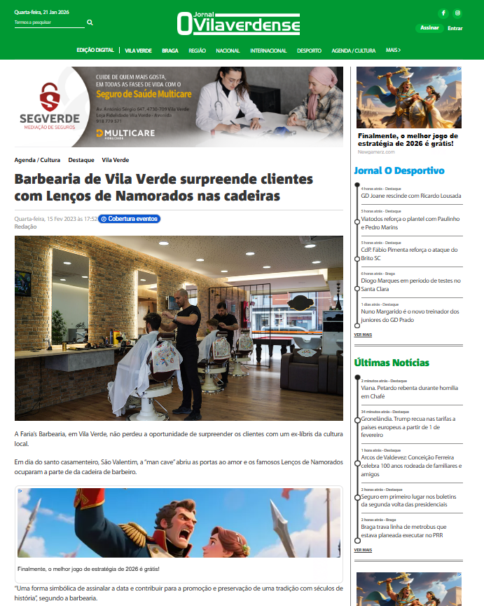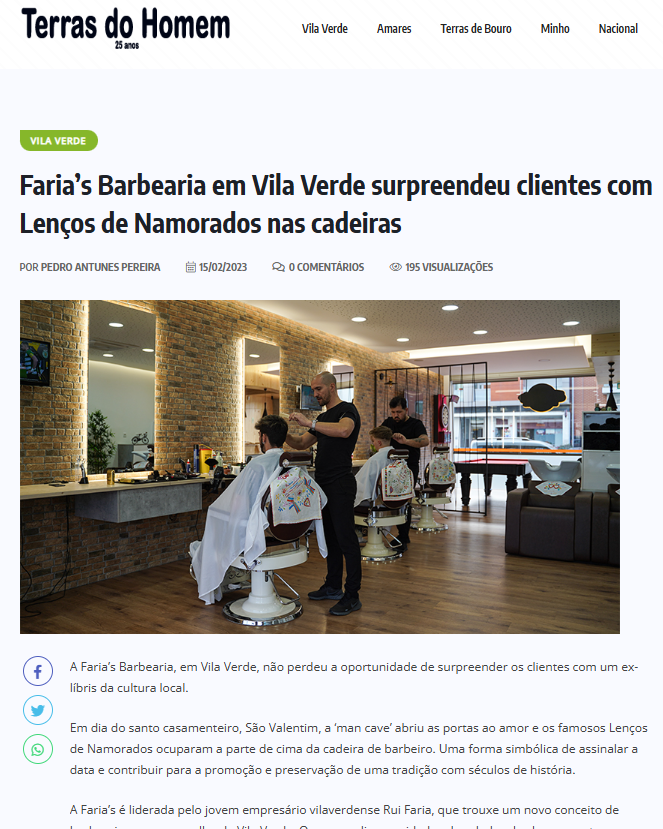 No Dia dos Namorados, a Faria’s Barbearia, em Vila Verde, trabalhou com Lenços de Namorados nas cadeiras. Uma forma simbólica de homenagear a cultura e a tradição local. Uma ideia simples que foi um sucesso nas redes sociais e que viu o alcance aumentado com a presença na comunicação social.